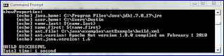 There are a couple of Java system properties, a couple of custom properties, and a few Ant built-in properties in this example. These allow me to easily demonstrate how properties can be overridden or not overridden. The next screen snapshot shows the "default" settings of the properties without being overridden. The two custom ones are not defined at all, but the others (Java system and Ant built-in properties) have values automatically set for the Ant build.